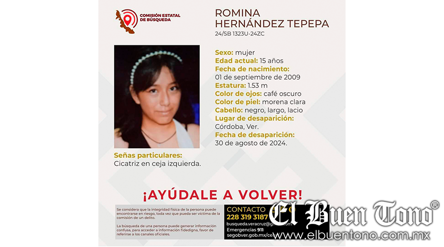 Córdoba. – La Comisión Estatal de Búsqueda emitió un boletín de emergencia, por la desaparición de la adolescente Romina Hernández Tepepa, de 15 años, quien fue vista por última vez, el pasado 30 de agosto en Córdoba.