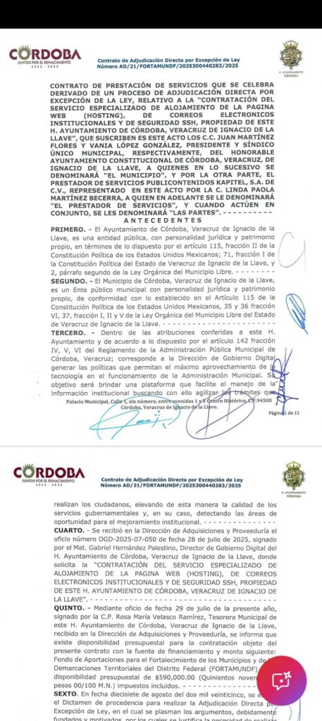 Pese a este historial, el municipio de Córdoba procedió a contratar a Publicontenidos Kapitel mediante un procedimiento excepcional que elude la licitación pública. El contrato, por un monto calculado de 508,620.60 pesos, es para servicios de alojamiento web, correos institucionales y seguridad SSH. La empresa, representada por Linda Paola Martínez Becerra, deberá cumplir con la prestación del servicio a entera satisfacción del municipio para recibir el pago final, que está pactado a más tardar el 31 de diciembre de 2025.