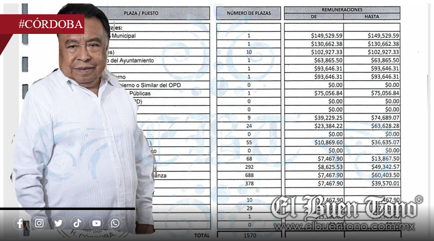 El documento oficial, firmado por el presidente municipal Juan Martínez Flores, muestra que en total hay mil 570 plazas, entre las que destacan salarios exorbitantes como el del propio alcalde, quien percibe 149 mil 529 pesos mensuales, seguido por el síndico con 130 mil 662 pesos y cada uno de los diez regidores con un sueldo de 102 mil 927 pesos.
