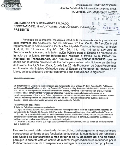 Córdoba, Ver.- El Ayuntamiento de Córdoba ha omitido proporcionar cualquier documentación que acredite el paradero de las estructuras metálicas, duelas de plástico y demás componentes retirados de la plataforma peatonal ubicada en calle 1 entre avenidas 3 y 5, obra que tuvo un costo superior a 1.7 millones de pesos financiados con recursos federales del FORTAMUN 2022.