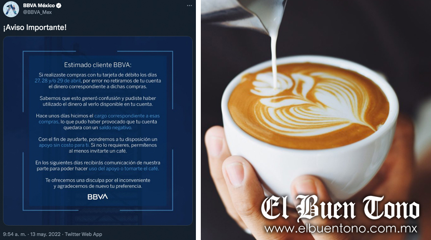 BBVA México informó a través de sus redes sociales que le invitará un café a los clientes que sufrieron modificaciones en sus cuentas los días 27, 28 o 29 de abril.