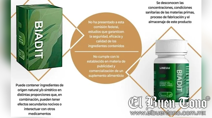 CDMX.- La Comisión Federal para la Protección contra Riesgos Sanitarios (Cofepris) emitió una alerta de riesgo al consumir el producto denominado Biadit, que se comercializa para personas con diabetes, por contener ingredientes que no deberían ser utilizados.