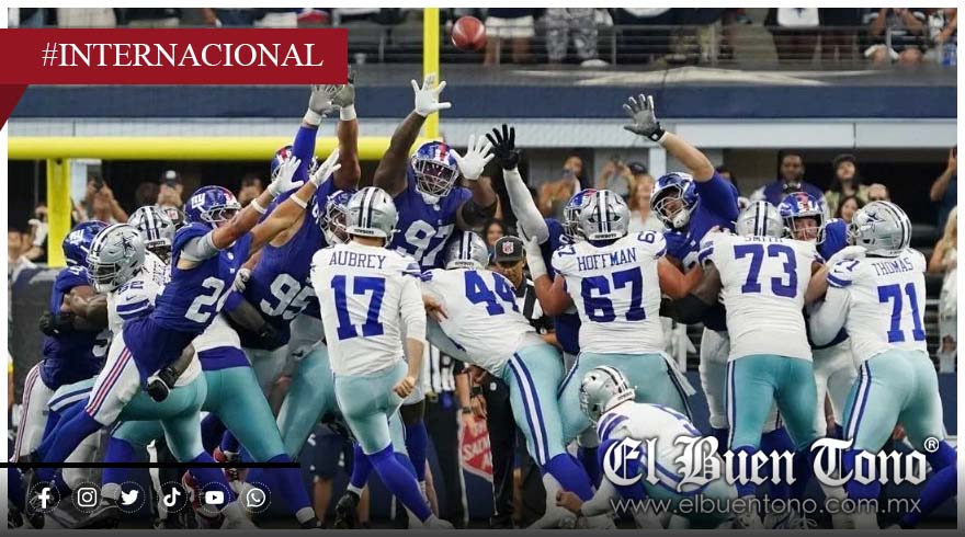 Dallas, TX.- En un cierre de infarto, los Dallas Cowboys derrotaron 40-37 a los New York Giants gracias a una actuación estelar del pateador Brandon Aubrey, quien concretó un gol de campo de 46 yardas en la última jugada del tiempo extra. Antes, Aubrey había empatado el marcador con un impresionante gol de 64 yardas al final del tiempo reglamentario.