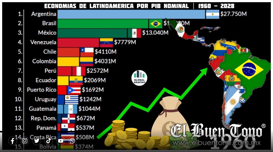 Internacional.- América Latina mantiene una estructura económica dominada por dos grandes potencias: Brasil y México, que lideran el ranking de las economías más fuertes de la región rumbo a 2026.
