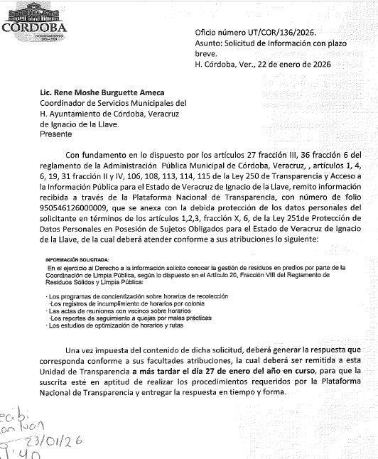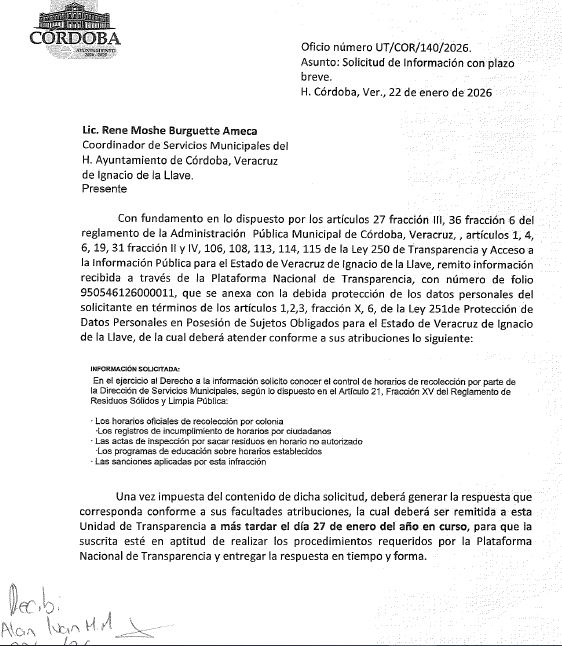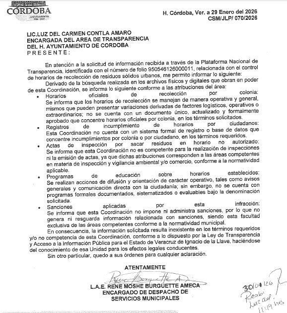 Córdoba, Ver.- Ante el problema de la basura no hay controles, ni sanciones y ni programas claros, revelan documentos oficiales. La Coordinación de Servicios Municipales, encabezada por René Moshe Burguette Ameca, admitió en respuestas escritas que no cuenta con horarios oficiales de recolección por colonia, ni registros de incumplimiento, ni actas de inspección, ni programas de educación formal, ni sanciones aplicadas por sacar basura en horarios no autorizados.