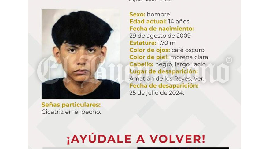 Amatlán.- La familia Montiel Muñoz busca a Gael quien tiene 14 años de edad y desapareció este 25 de julio, a la búsqueda se han sumado amistades y docentes de la Escuela Secundaria Técnica Industrial de Peñuela, de dónde es estudiante.