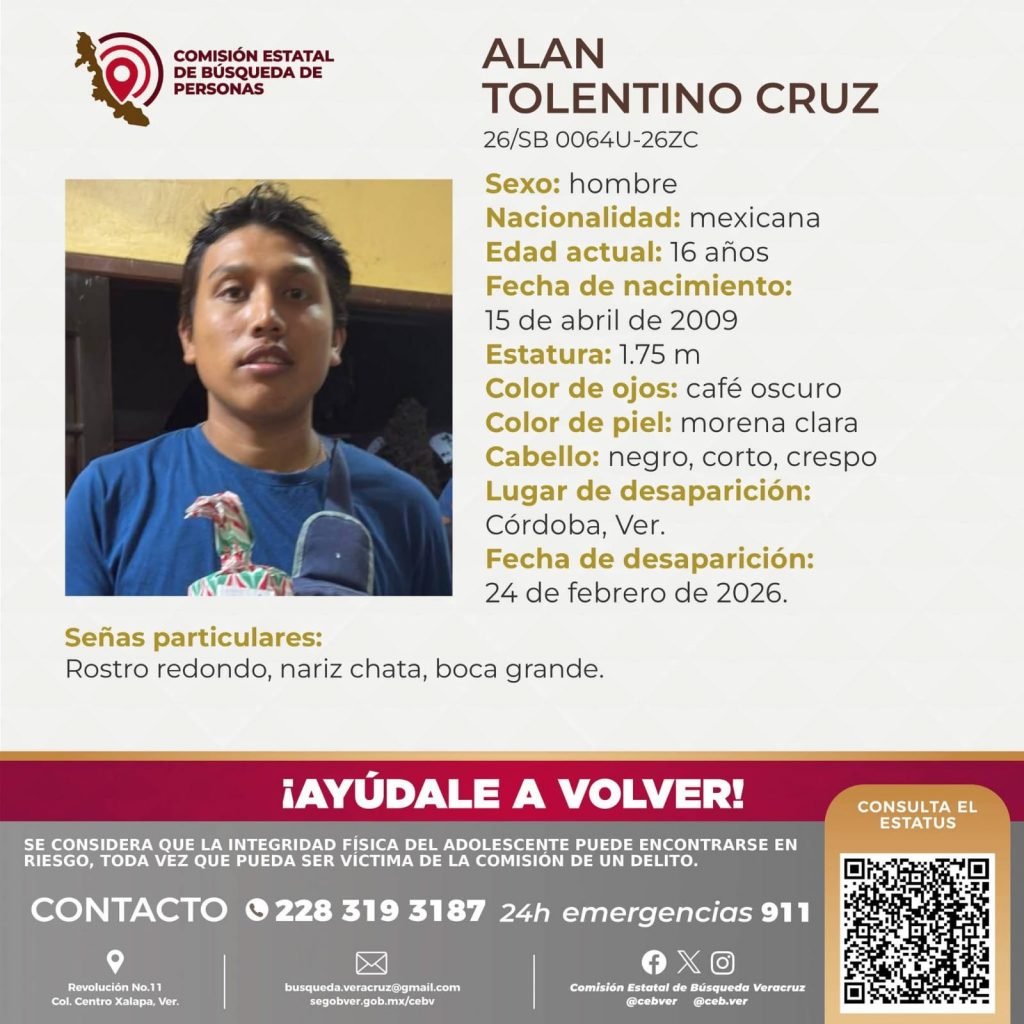 Córdoba, Ver.- La Comisión Estatal de Búsqueda de Veracruz emitió un boletín de emergencia para localizar a Alan Tolentino Cruz, de 16 años de edad, quien fue reportado como desaparecido tras ser visto por última vez el pasado 24 de febrero en este municipio.