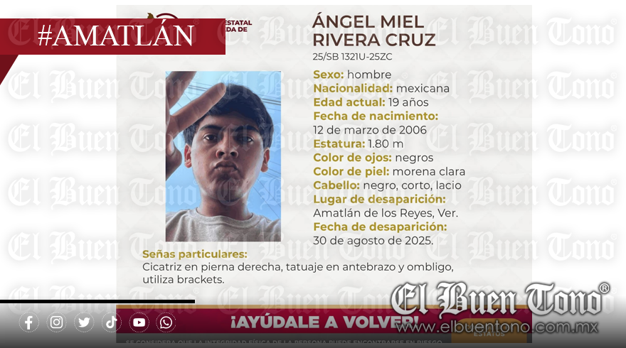 Amatlán, Ver – Un joven de 19 años de edad, identificado como Ángel Miel Rivera Cruz, esta reportado como desaparecido desde el día 30 de agosto.