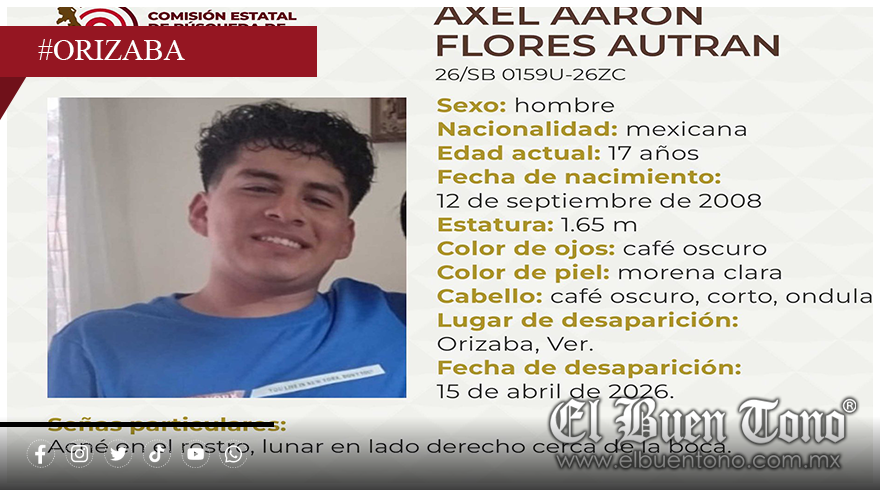 Orizaba.- Autoridades y familiares solicitan el apoyo de la ciudadanía para localizar al adolescente Axel Aaron Flores Autran, de 17 años, quien fue reportado como desaparecido el pasado 15 de abril en el municipio de Orizaba.