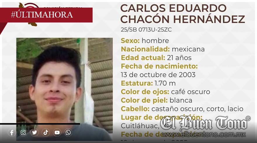 Cuitláhuac, Ver.- Un joven identificado como Carlos Eduardo Chacón Hernández, de 21 años de edad, está reportado como desaparecido desde el día 18 del presente mes.