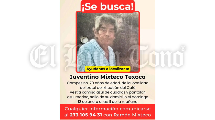 Ixhuatlán del Café, Ver.- Juventino Mixteco Texoco, de 70 años de edad, vecino de la comunidad Izotal, esta reportado como desaparecido desde el día de ayer.