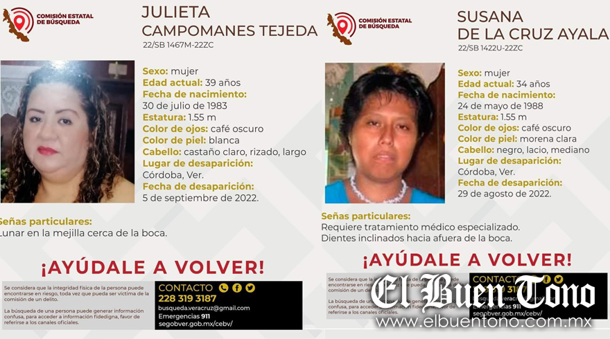 Córdoba.- Dos mujeres identificadas como Julieta Campomanes Tejeda y Susana de la Cruz Ayala son buscadas a través de la Comisión Estatal de Búsqueda de personas desaparecidas, luego de que familiares acudieran ante la unidad integral de procuración de justicia especializada en delitos diversos de la Fiscalía Regional.