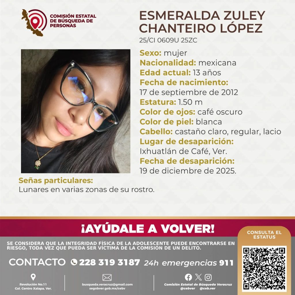 Ixhuatlán del Café, Ver.- Una menor de 13 años de edad, de nombre Esmeralda Zuley Chanteiro López, esta reportada como desaparecida desde el día 19 del presente mes