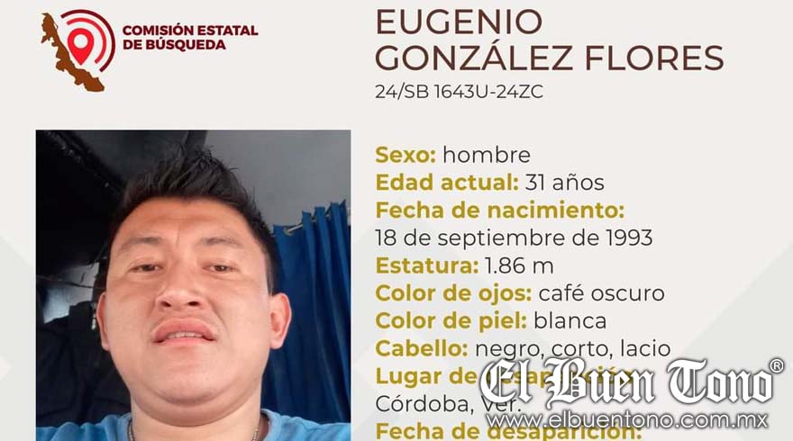 Córdoba.- Un hombre de 31 años, identificado como Eugenio González Flores, fue reportado como desaparecido desde el 24 de octubre en Córdoba. La Comisión Estatal de Búsqueda emitió un boletín de emergencia para agilizar su localización con vida.