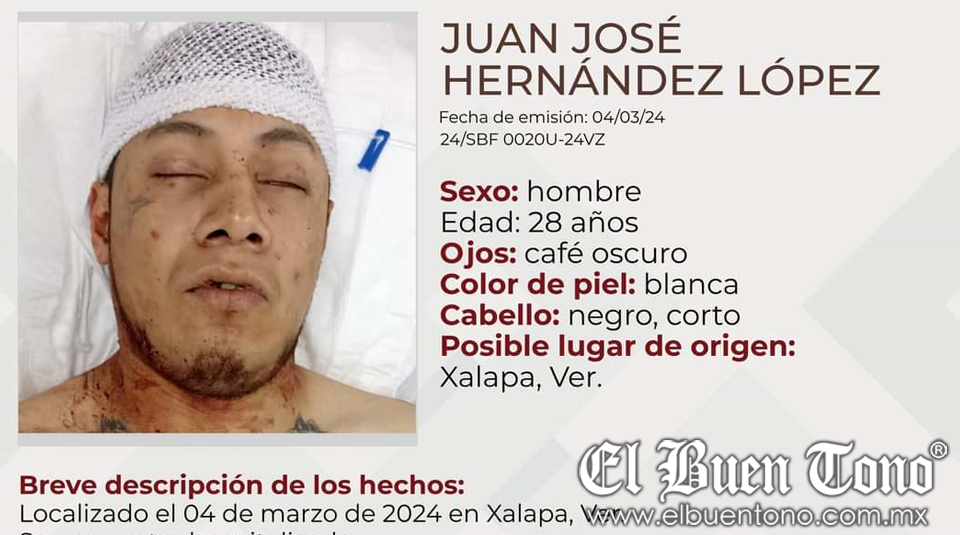 Xalapa.- A través de la Comisión Estatal de Búsqueda, se emitió un reporte solicitando ayuda para localizar a los familiares del joven Juan José Hernández López, quien actualmente se encuentra hospitalizado debido a un ataque con un arma blanca en la colonia Carolino Anaya de la capital del estado.