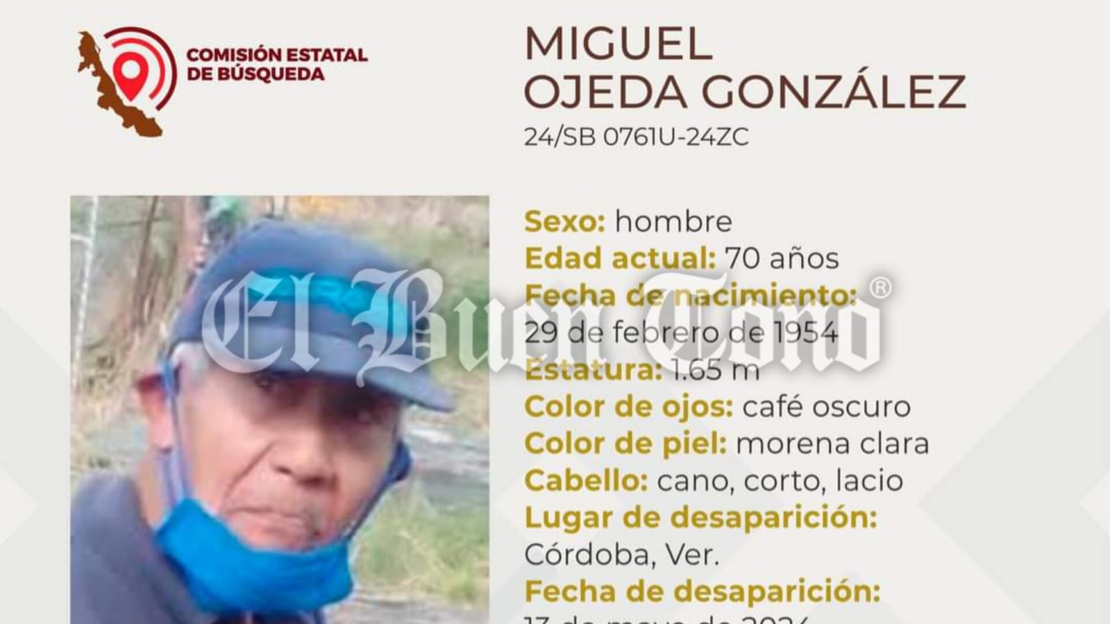 Córdoba, Ver.- Un hombre de la tercera edad, identificado como Miguel Ojeda González, es buscado por su familia ya que desde el pasado 13 de mayo se encuentra como desaparecido.
