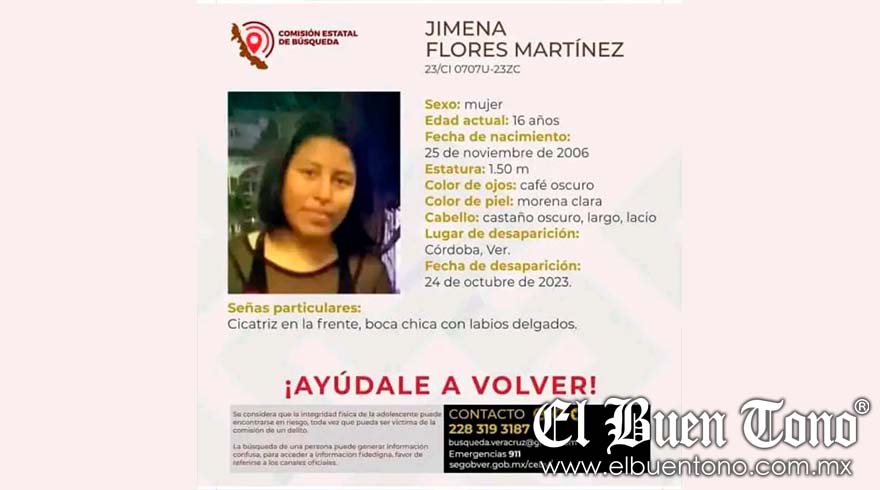Córdoba.- Una menor de 16 años de edad, identificada como Jimena Flores Martínez, se encuentra como desaparecida desde el pasado 24 de octubre.