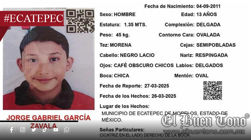 Ecatepec, EdoMex.- Jorge Gabriel García Zavala, de 13 años, fue reportado como no localizado el pasado 26 de marzo en Ecatepec, Estado de México. El menor salió de su casa en la colonia Fuentes de Aragón tras una discusión familiar relacionada con sus calificaciones escolares.