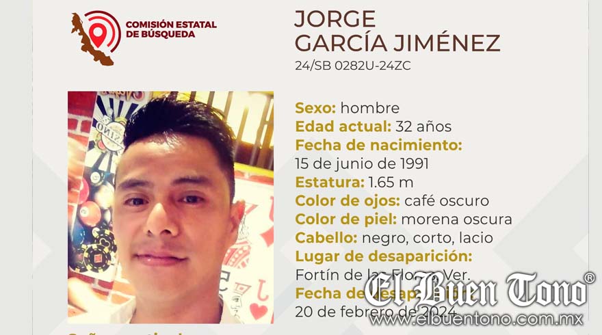 Fortín, Ver.- Un joven identificado como Jorge García Jiménez, de 32 años de edad, se encuentra desaparecido desde el pasado 20 de febrero. Su familia solicita el apoyo de las autoridades policiales y de la ciudadanía en general para localizarlo sano y salvo. La Comisión Estatal de Búsqueda de Personas Desaparecidas ya emitió su alerta a las diferentes corporaciones policiales para localizarlo.