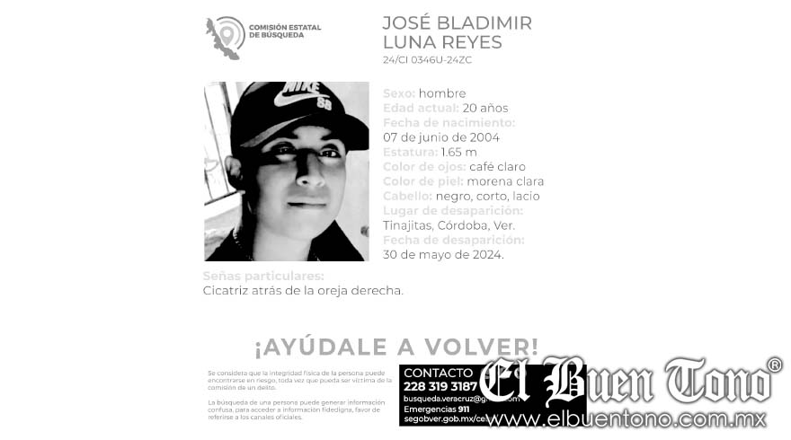 Ixhuatlán del Café.- José Luis Bladimir Luna Reyes, de 20 años de edad, vecino de esta localidad, es buscado por sus familiares luego de haber sido reportado desaparecido en la ciudad de Córdoba.