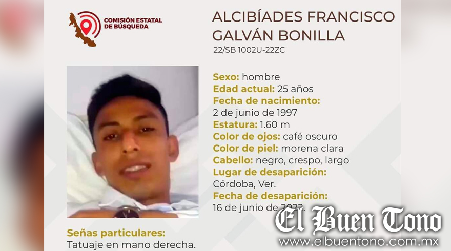 Córdoba.- Un joven de nombre Alcibíades Francisco Galván Bonilla, de 25 años de edad, fue reportado ante la Comisión Estatal de búsqueda de personas desaparecidas, debido a que sus familiares perdieron todo tipo de comunicación con él desde el pasado día 16 del presente mes, por lo que temen algo de malo le haya ocurrido, pidiendo el apoyo de la población para que en caso de tener algún informe que pueden servir para dar con su paradero favor de comunicarse al número de emergencia 911.