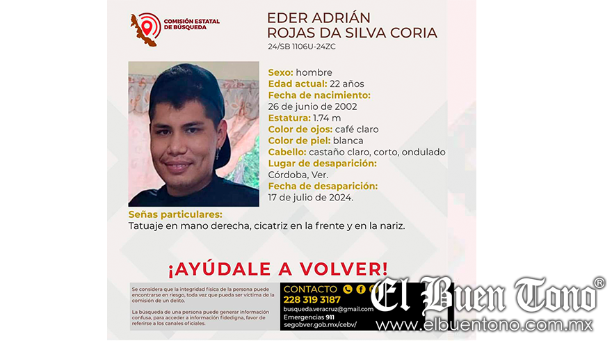 Córdoba. – La Comisión Estatal de Búsqueda emitió un boletín de emergencia, por la desaparición de Eder Adrian Rojas Da Silva Coria, de 22 años, quien fue visto por última vez el pasado 17 de julio en Córdoba.