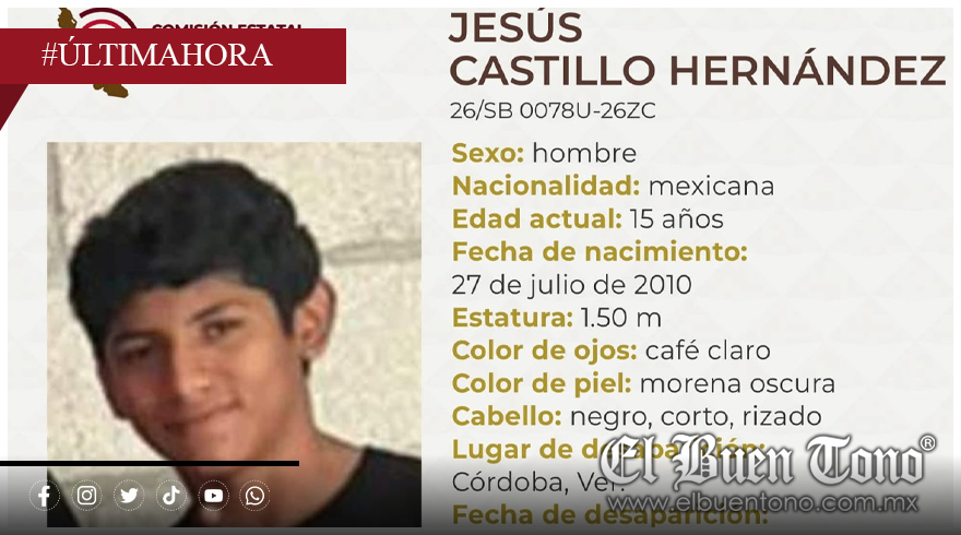 Córdoba.- Familiares y amigos del adolescente Jesús Castillo Hernández, de 15 años, pidieron el apoyo de la ciudadanía para localizarlo. Desapareció el pasado 4 de marzo en Córdoba y hasta ahora su familia no ha logrado encontrarlo.