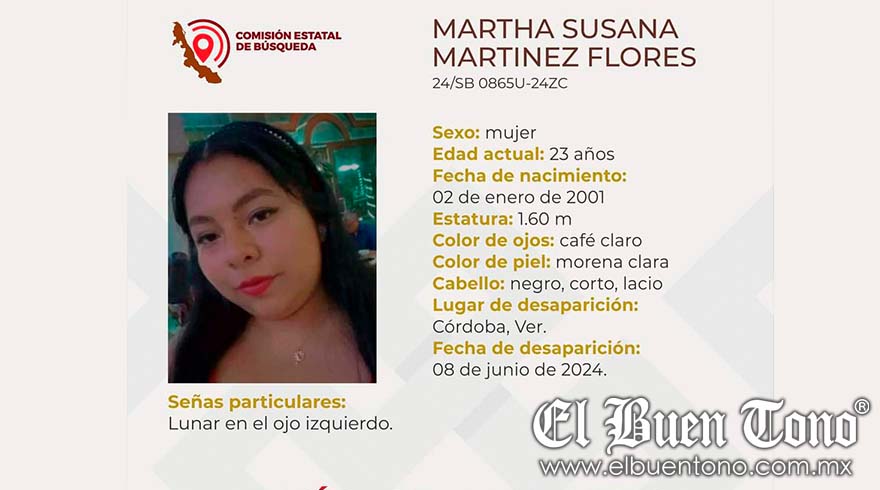 Coscomatepec.- Una joven identificada como Martha Susana Martínez Flores, de 23 años de edad, es reportada como desaparecida desde el día sábado 8 de junio.
