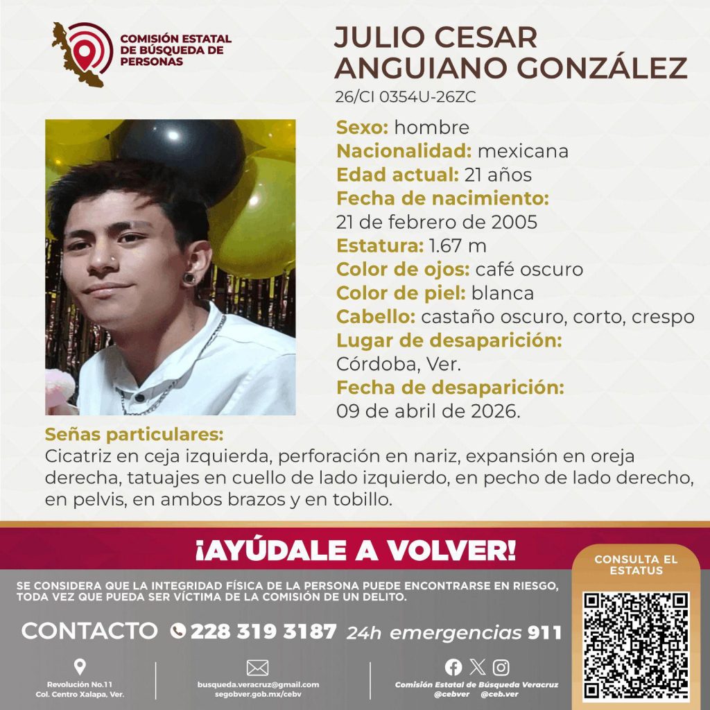 Córdoba.- Autoridades y familiares solicitan la colaboración de la ciudadanía para localizar a Julio César Anguiano González, quien se encuentra en calidad de desaparecido.