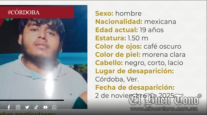 Córdoba, Ver.- La Comisión Estatal de Búsqueda emitió un boletín de emergencia por la desaparición de Maximiliano Torres Pedro, de 19 años, quien fue visto por última vez el pasado sábado 2 de noviembre en Córdoba.