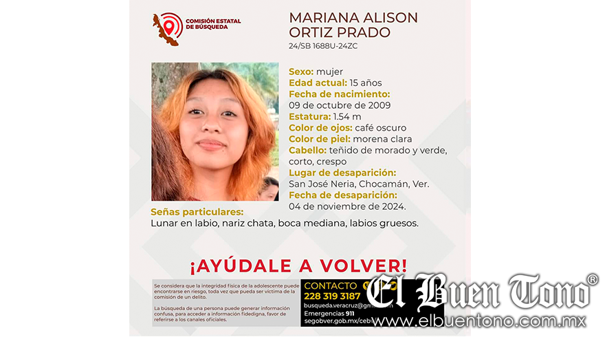 Córdoba, Ver. – Familiares de Mariana Alison Ortiz Pardo, de 15 años, solicitan apoyo para localizarla, ya que fue reportada como desaparecida desde el 4 de noviembre.