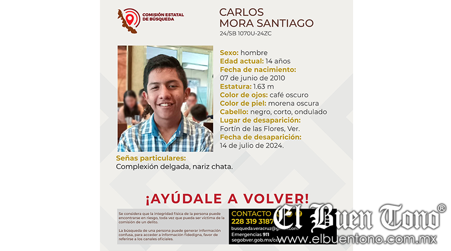 Fortín, Ver.- Un menor de 14 años de edad, identificado como Carlos Mora Santiago, esta reportado como desaparecido desde el día de ayer domingo 14 de julio.