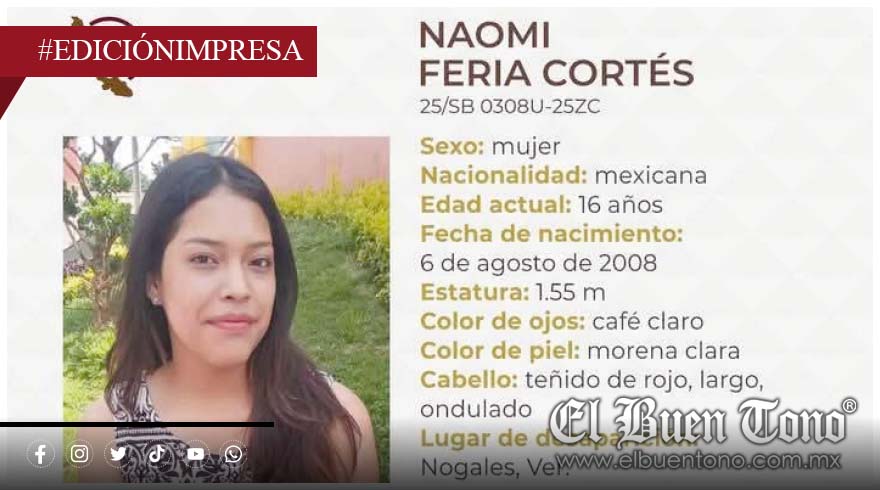 NOGALES.- Una adolescente, identificada como Naomi Feria Cortés, de 16 años de edad, esta reportada como desaparecida desde el día lunes 3 de marzo.