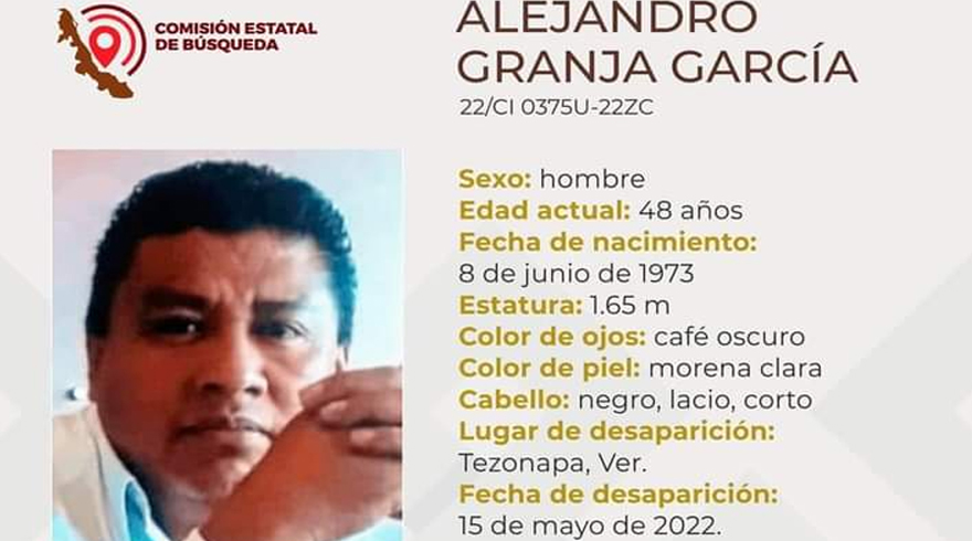 Tezonapa.- A través de la Comisión Estatal de Búsqueda de Personas Desaparecidas, es buscado un hombre de nombre Alejandro Granja García, de 48 años de edad, con domicilio en Tezonapa, luego de que desapareciera desde el pasado día 15 cuando salió de su domicilio, perdiendo sus familiares toda comunicación con él.