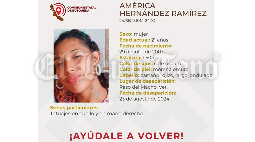 Córdoba.- La Comisión Estatal de Búsqueda emitió un boletín de emergencia, por la desaparición de América Hernández Ramírez, de 21 años, quien fue vista por última vez el pasado 23 de agosto en Paso del Macho.