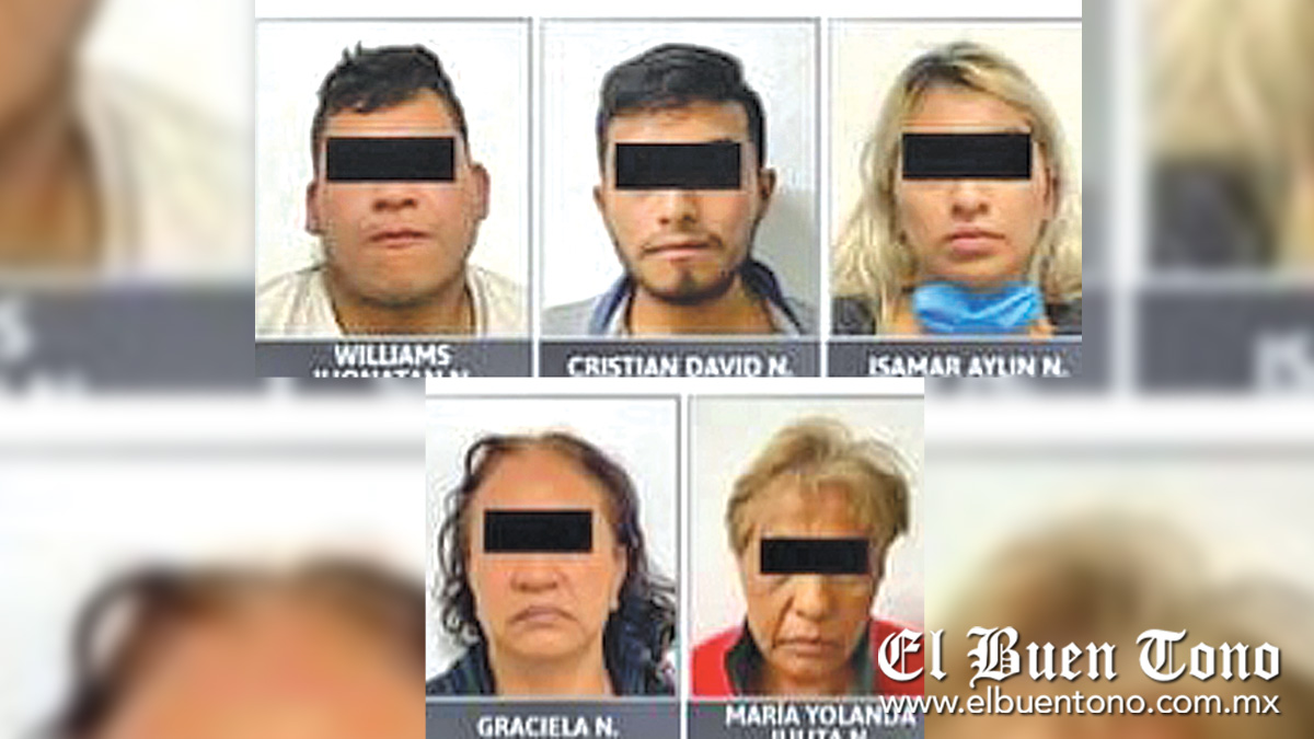 Los detenidos son: Jonathan “N” de 23 años, Cristian David “N” de 20, Isanar Aiylin “N” de 26 años, Graciela “N” de 50 y María Yolanda “N” de 59 años, además de un vehículo Nissan color rojo, placas del Estado de México.
