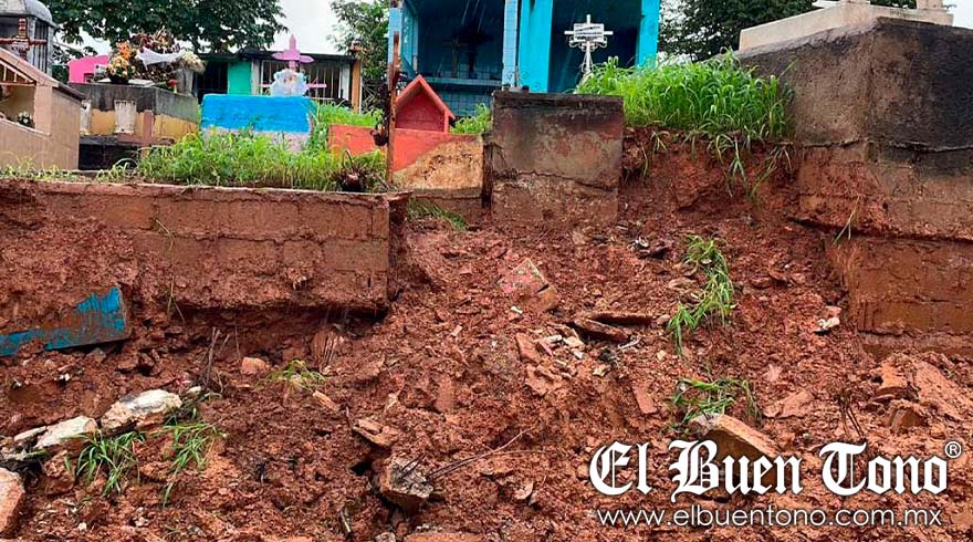 Con el desgaje de la tierra, se llevó la barda y afectó al menos tres tumbas dejando al descubierto otras dos. El montículo con pedazos de pared y ataúdes cayó sobre el callejón Ánimas, en un costado del panteón, ubicado en el popular barrio Tamarindo de esta ciudad.