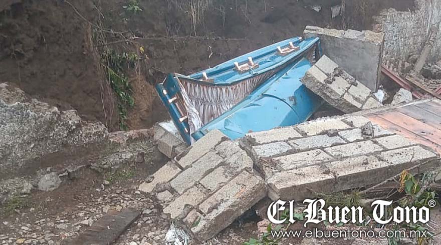 Totutla.- Debido a las fuertes lluvias que se registraron en la cabecera municipal, la barda del panteón municipal se desplomó, y un ataúd salió a la superficie con los restos de una persona expuestos, lo que conmocionó a la población.