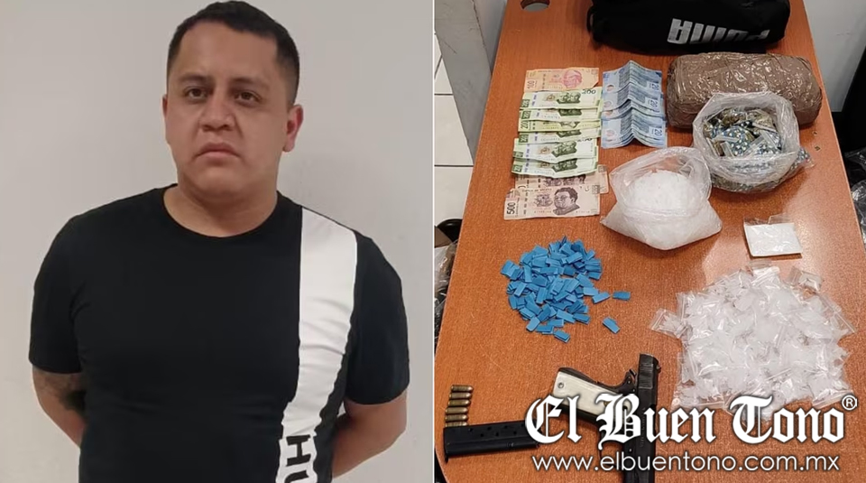Durante la detención, las autoridades encontraron en posesión de “El Pozoles” una mochila de color negro con una correa que llevaba la leyenda “Puma” en blanco, la cual contenía 98 bolsitas de plástico transparente con marihuana. También se incautó un paquete de 500 gramos de cocaína, envuelto con cinta adhesiva de color café, así como 93 envoltorios de papel azul con cocaína.