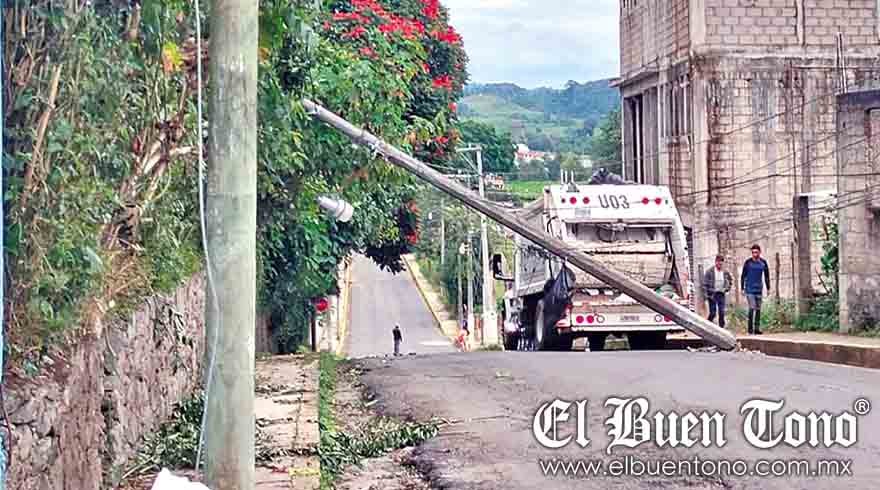 Coscomatepec.- Un poste de la Comisión Federal de Electricidad (CFE), cayó ayer a un costado de la carretera estatal Coscomatepec-Tozongo, justo a la entrada del panteón municipal, lo que provocó la interrupción del suministro de energía en perjuicio de unas 20 mil personas.