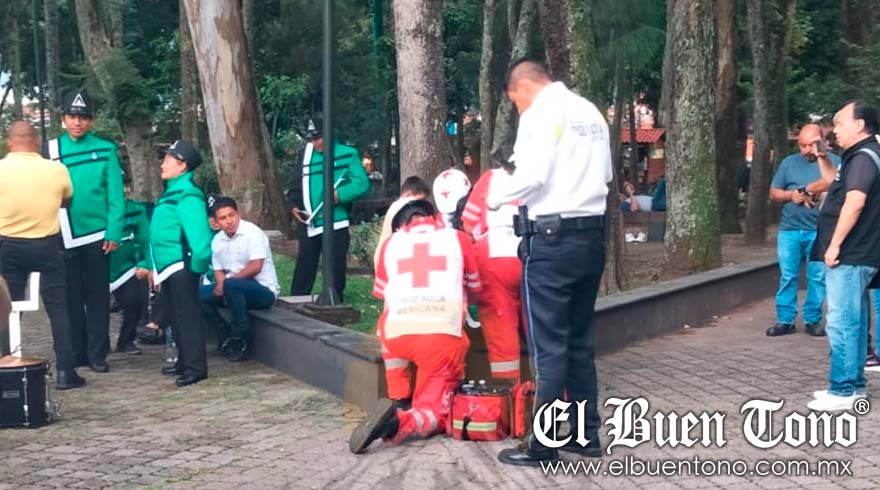ORIZABA.- Un joven integrante de una Marching Band, fue auxiliado por paramédicos de la Cruz Roja, tras caerle una rama que se desgajó de un árbol, cuando se encontraba tocando en la alameda de Francisco Gabilondo, Cri-Crí.
