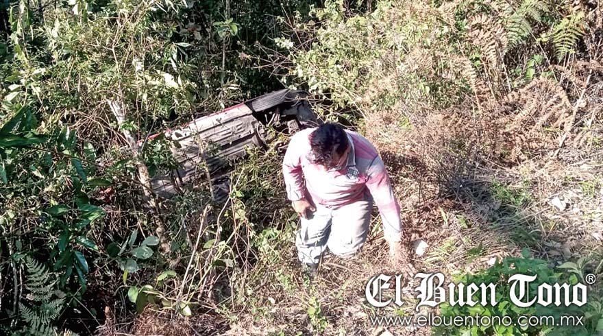 San Juan Texhuacan.- Un taxi de la ciudad de Orizaba terminó siniestrado en un barranco de unos 15 metros, tras salirse de la carretera federal Orizaba-Zongolica.