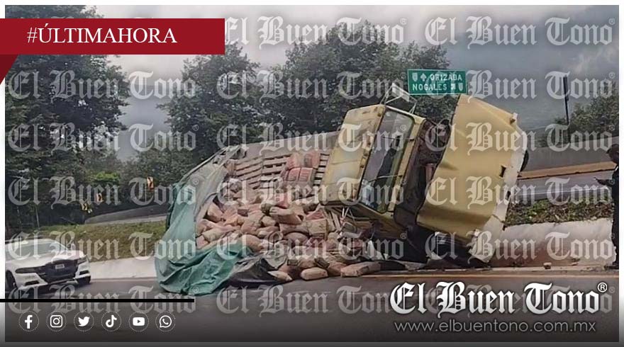 Nogales, Ver., 24 de septiembre de 2025.- La tarde de este miércoles se registró un accidente sobre la autopista Orizaba–Puebla, a la altura de la curva de la Laguna de Nogales, donde un camión de carga tipo torton, cargado con bultos de cemento, perdió el control y terminó en la zona de acotamiento.