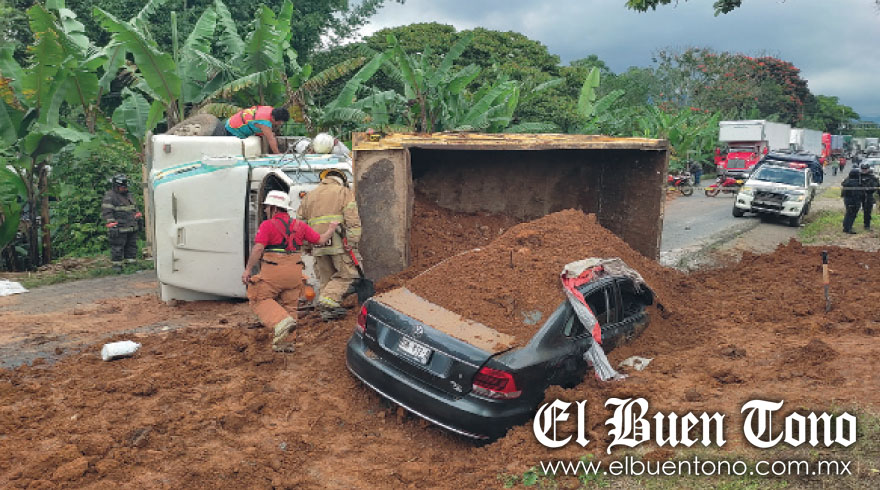 Fortín.- Cuatro personas lesionadas entre ellas un menor de edad, movilización de los servicios de emergencia y el cierre de la circulación, fue el resultado de la volcadura de un camión cargado con tierra, el cual sepultó a un vehículo particular sobre la carretera federal Fortín-Huatusco la