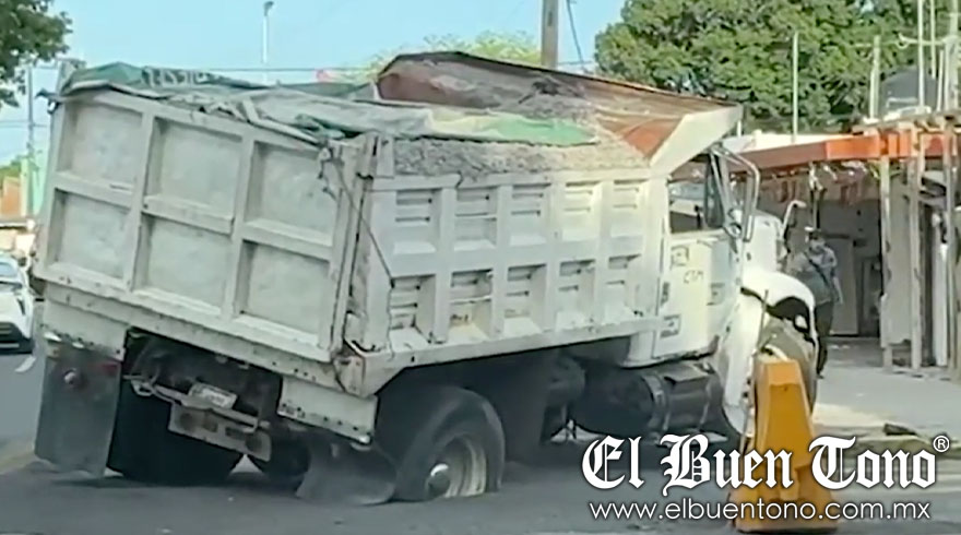 Veracruz.- Esta mañana, un camión de volteo cargado con grava cayó en un socavón en la Avenida Cristóbal Colón, esquina con Fernando Siliceo, obstruyendo dos carriles de la vía.