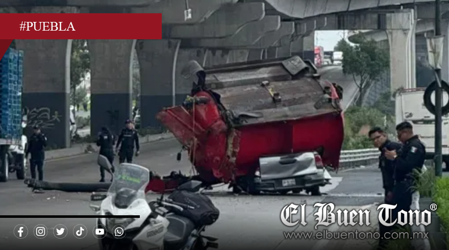 Puebla.- Una escena de horror se vivió este viernes en la autopista México-Puebla, a la altura de la incorporación al Bulevar Hermanos Serdán, cuando un camión repartidor de refrescos se incendió en el segundo piso de la vialidad y parte de su estructura colapsó, cayendo desde varios metros de altura sobre una camioneta particular que transitaba por el nivel inferior.