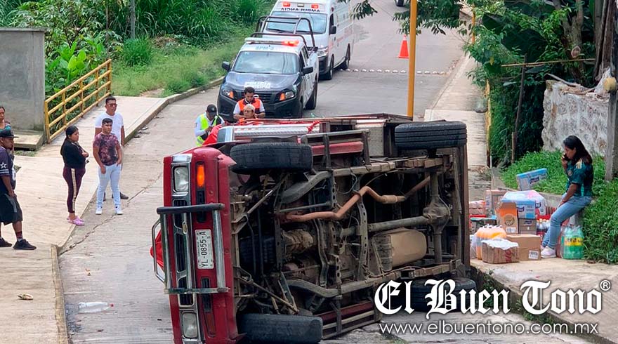 Chocamán.- Una camioneta cargada de abarrotes volcó en una pendiente de la calle Morelos, donde pretendía subir al centro del municipio, pero debido al peso se fue de reversa y volcó.