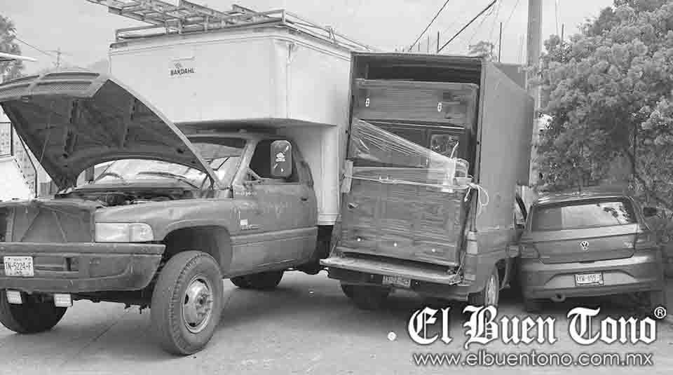 Chocamán.- Una falla mecánica provocó que una camioneta de tres toneladas, se fuera de reversa e impactara a dos vehículos que circulaban por la carretera estatal a Chocamán, a la altura de la capilla de Neria.