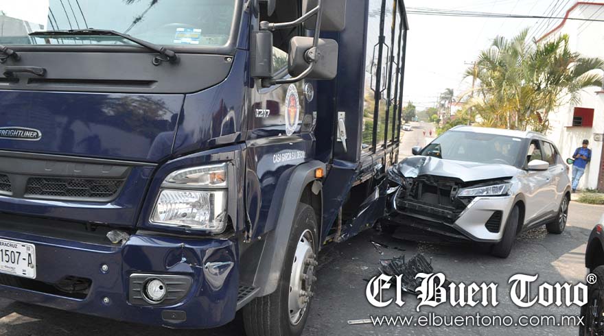 FORTÍN.- Una camioneta quedó dañada de la parte frontal, al chocar contra un camión de empresa cervecera, cuando circulaban en el fraccionamiento Los Pinos.