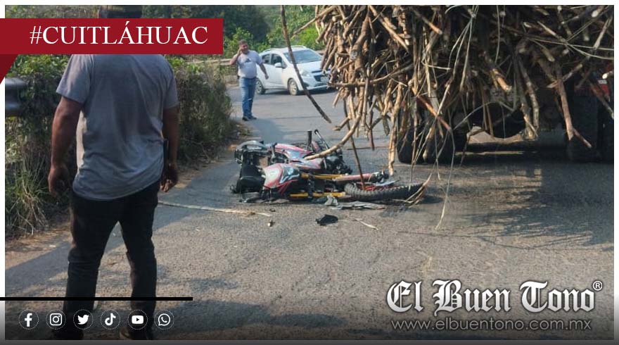 Cuitláhuac.- Un motociclista fue trasladado delicado al Hospital General de Córdoba, al impactarse contra un camión cañero el cual invadió el carril contrario al tomar una curva, en la carretera estatal Cuitláhuac-Atoyac, a la altura de la comunidad de El Maguey.